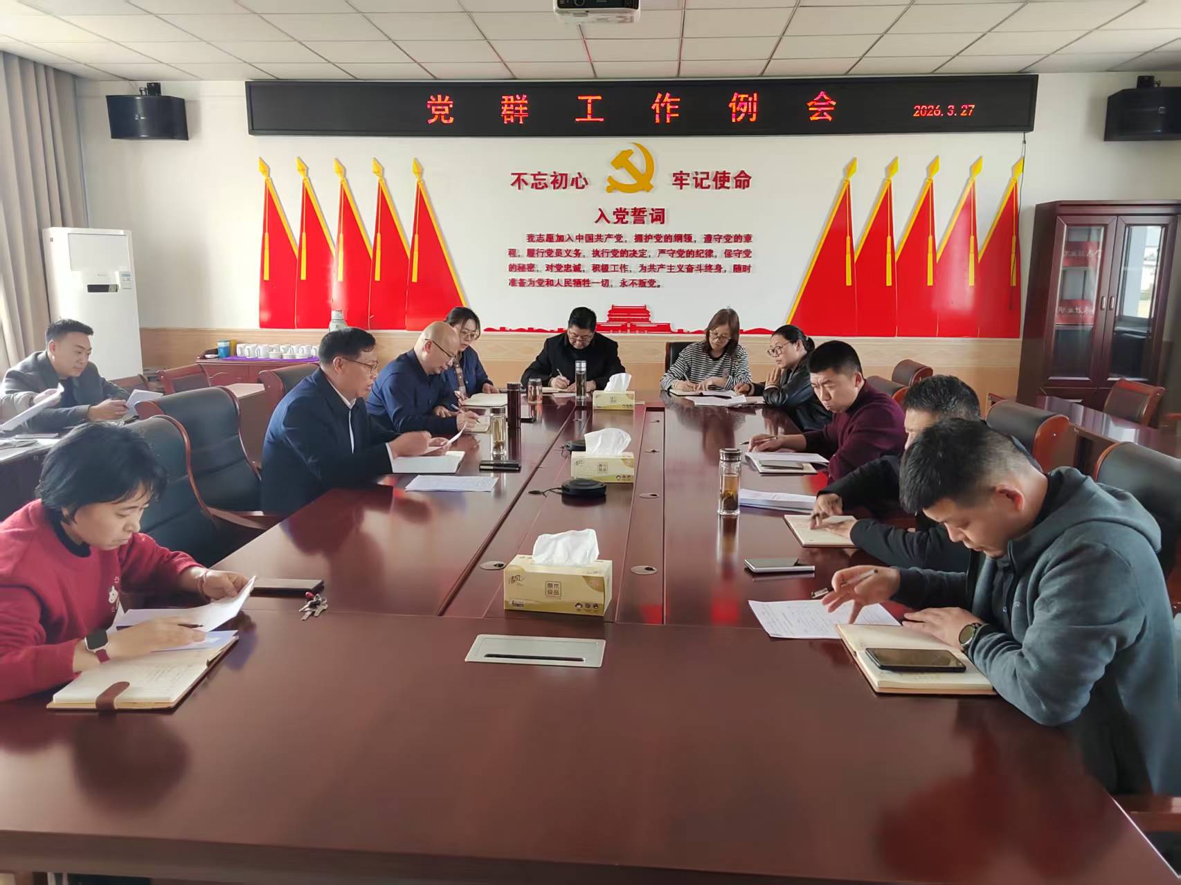 3月27日下午,我校2026年春学期党群工作例会在行政楼二楼会议室召开。党委书记刘必千出席会议并讲话。各直属党支部书记、党委职能部门负责人及相关工作人员参加会议。