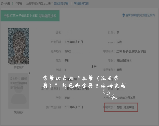 各位新生务必及时上网查询请确认本人学籍信息,经教育部网址能够查询到学籍信息的学生,表明已取得国家承认的学籍,否则,则表明未取得国家认可,毕业时将无法获得国家承认的毕业证书,也不能进行学历证书电子注册。为进一步确保学籍电子注册查询工作顺利完成现将有关事项通知如下: