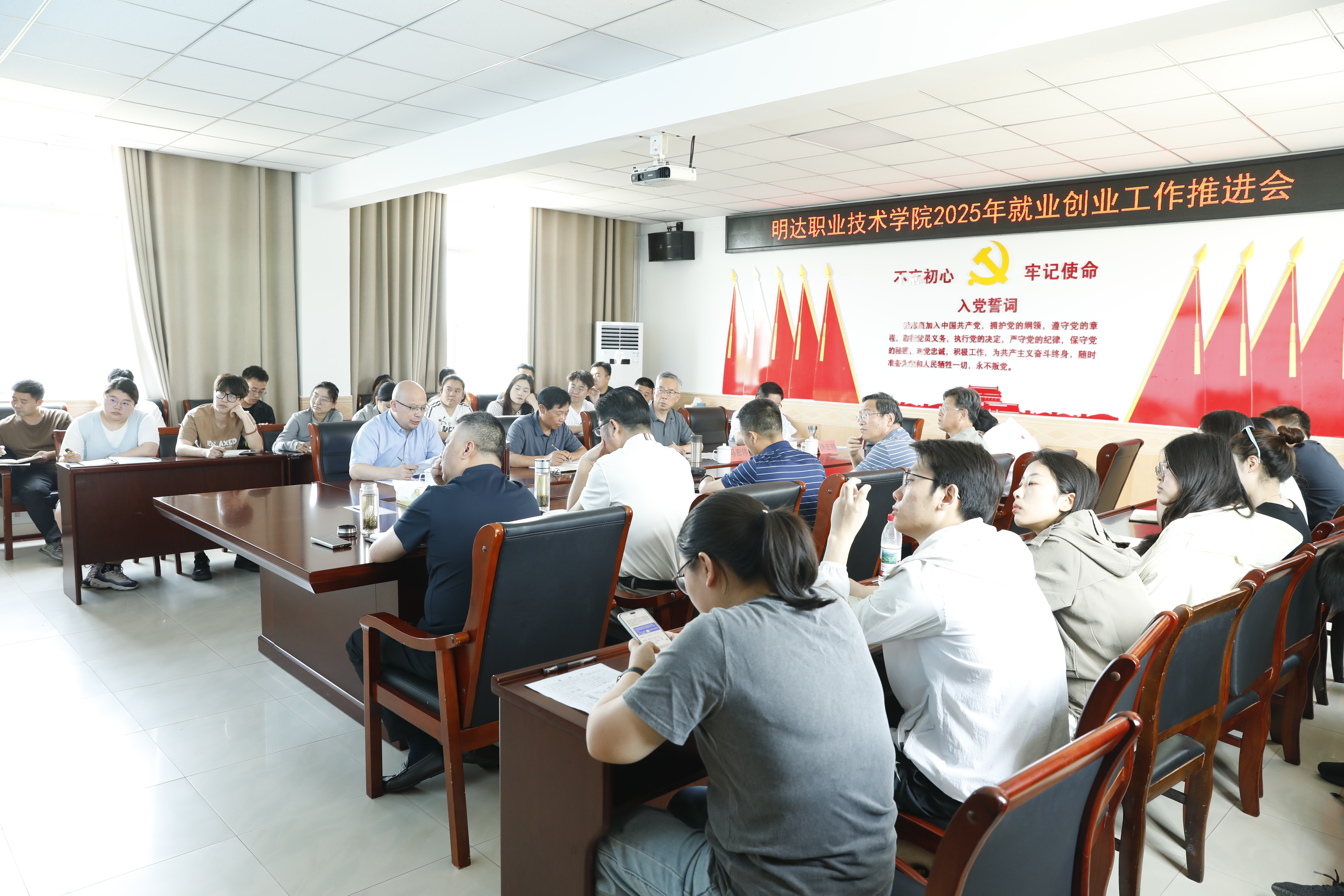 6月25日上午,我校在行政楼二楼会议室召开2025年就业创业工作推进会,校领导、二级学院院长、全体辅导员及就业创业工作相关人员参会,会议由副校长周凯猛主持。